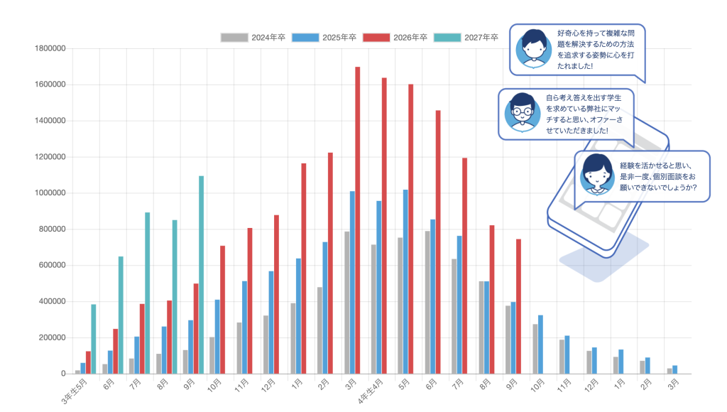 特に2026年卒では3年生の10月〜4年生の4月にかけてオファー数が急増し、ピーク時には月間180万件近くのオファーが発生しています。